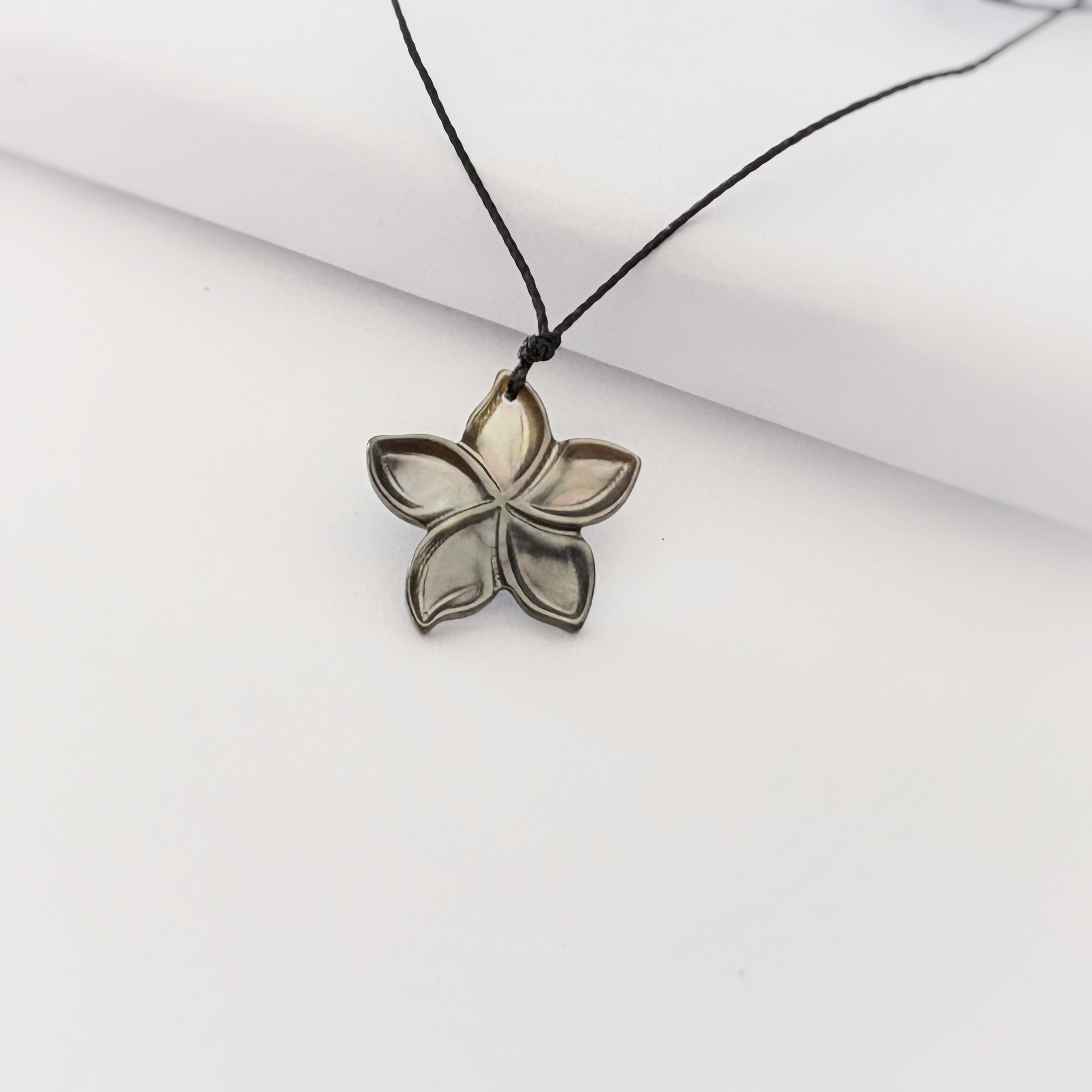 The "Melia" Plumeria necklace – a symbol of warmth and aloha. Each pendant is meticulously crafted from natural sea pearl shells, showcasing a unique finish in white or black tones.